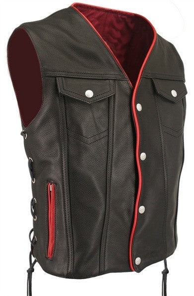 Gilet Biker Boléro en Cuir Noir Intérieur Rouge pour Homme